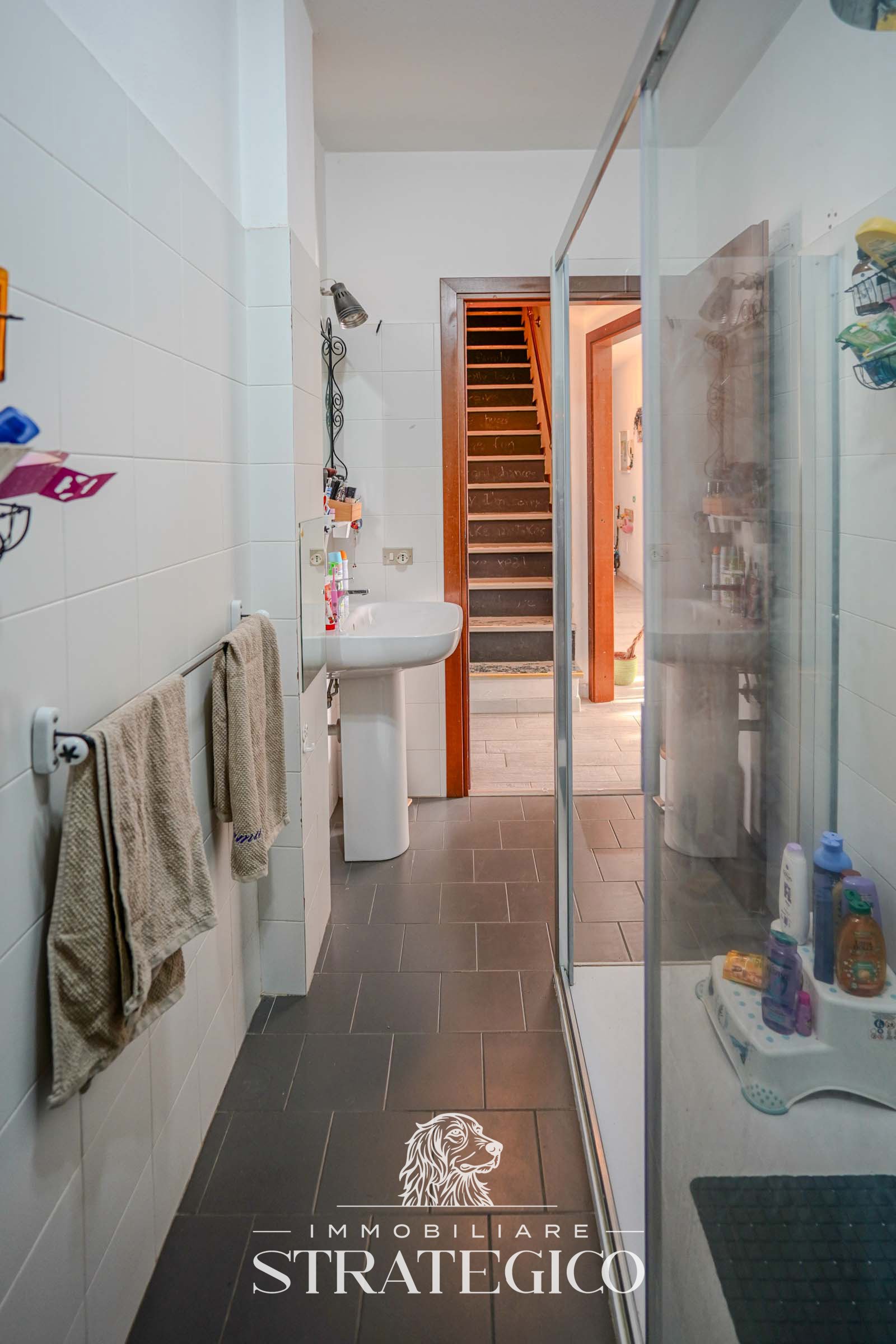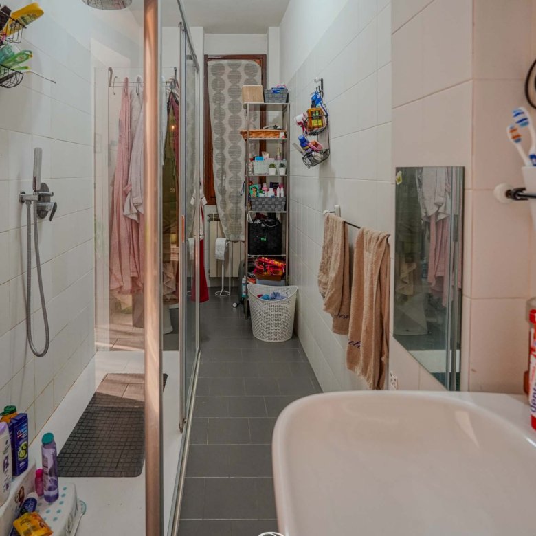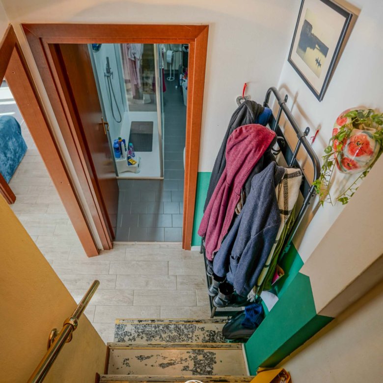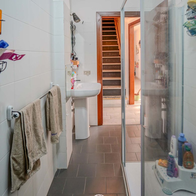 Completa il piano una sala indipendente. Sia dalla cucina che dalla sala si accede al balcone, che si sviluppa per tutta la lunghezza del primo livello, ampliando gli spazi vivibili e garantendo ottima luminosità. A servizio del piano è presente un bagno finestrato con ampia doccia, comodo e ben organizzato.