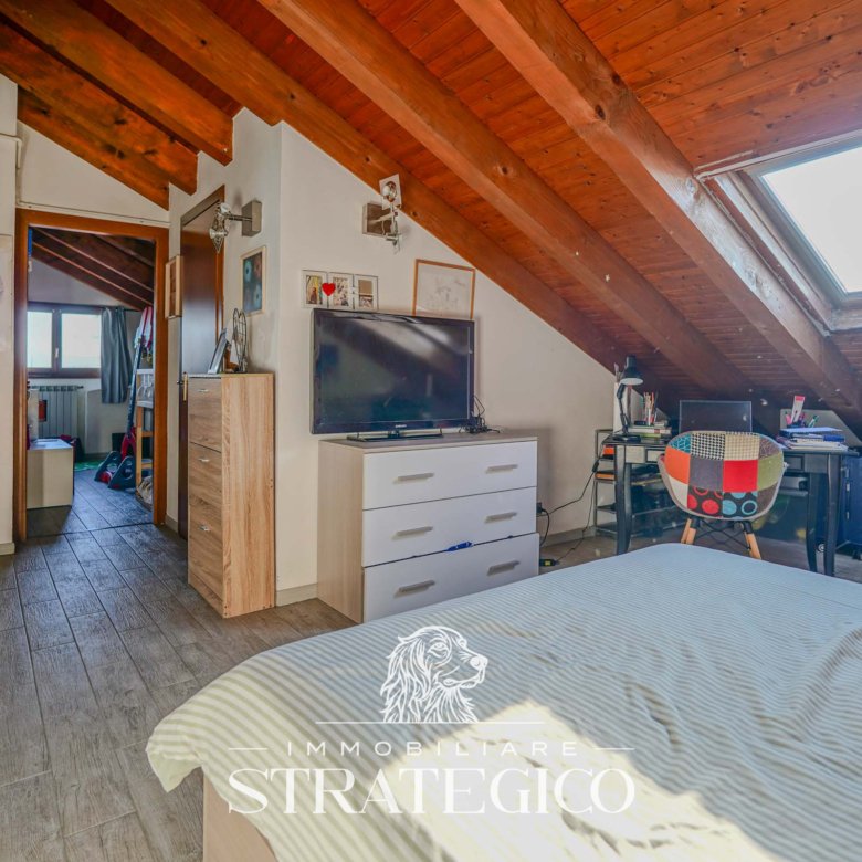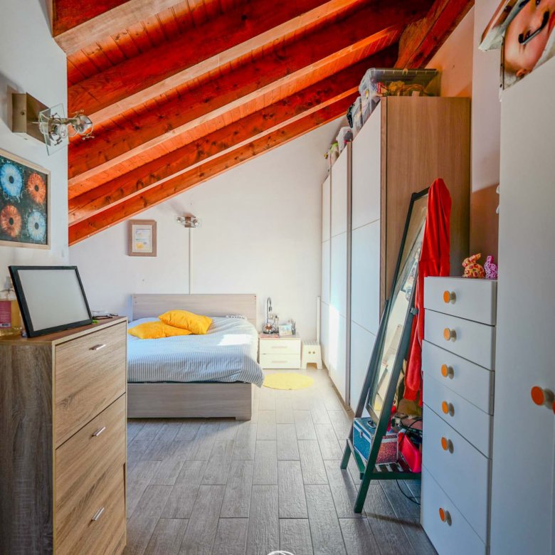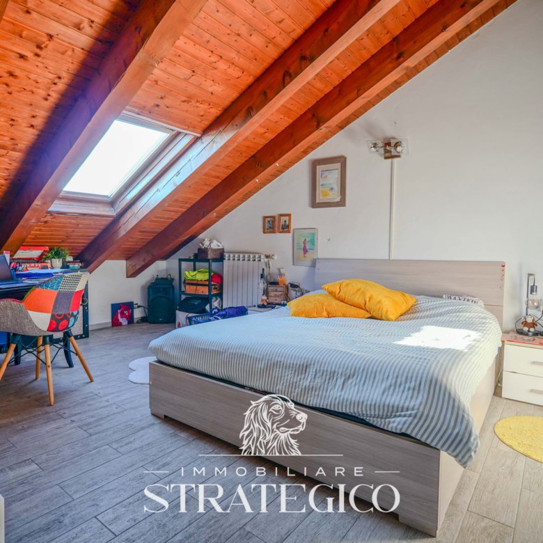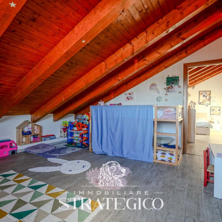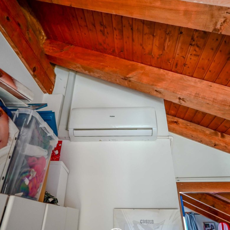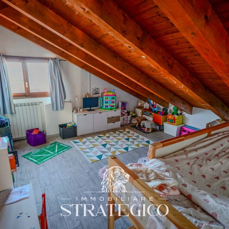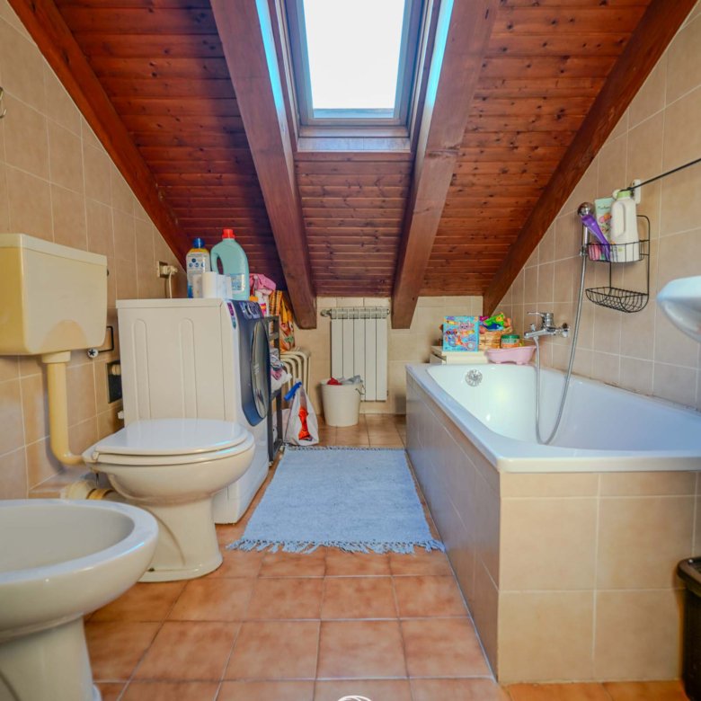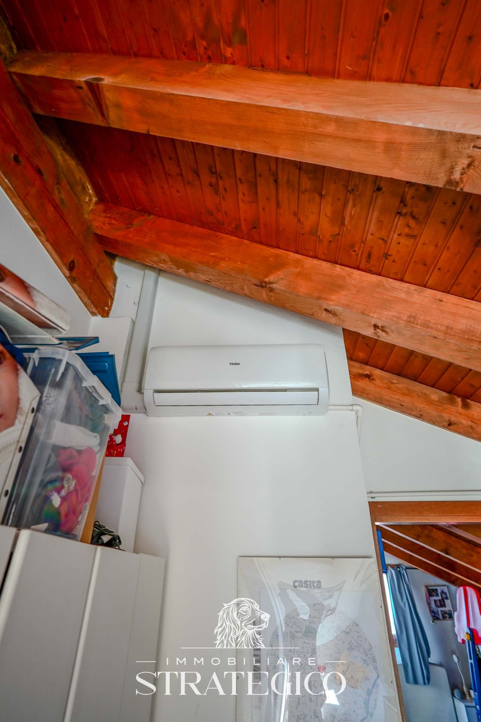 Al piano superiore si sviluppa la zona notte, composta da due ampie camere mansardate e da un secondo bagno con vasca; entrambi gli ambienti sono dotati di split per l’aria condizionata, garantendo comfort anche nei mesi estivi.