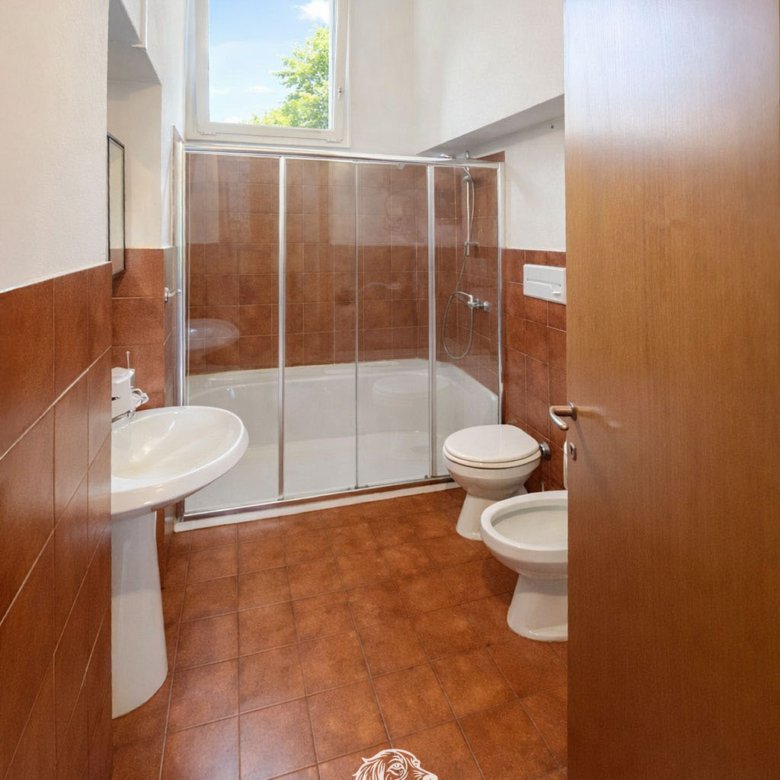 Al piano terra, oltre al garage, troviamo un atrio d’ingresso, un ripostiglio e la scala che conduce all’abitazione. L’appartamento al piano superiore è composto da soggiorno con balcone e uscita diretta sul giardino privato, cucina con sala da pranzo anch’essa collegata al giardino, due camere da letto, disimpegno, bagno principale e bagno di servizio.